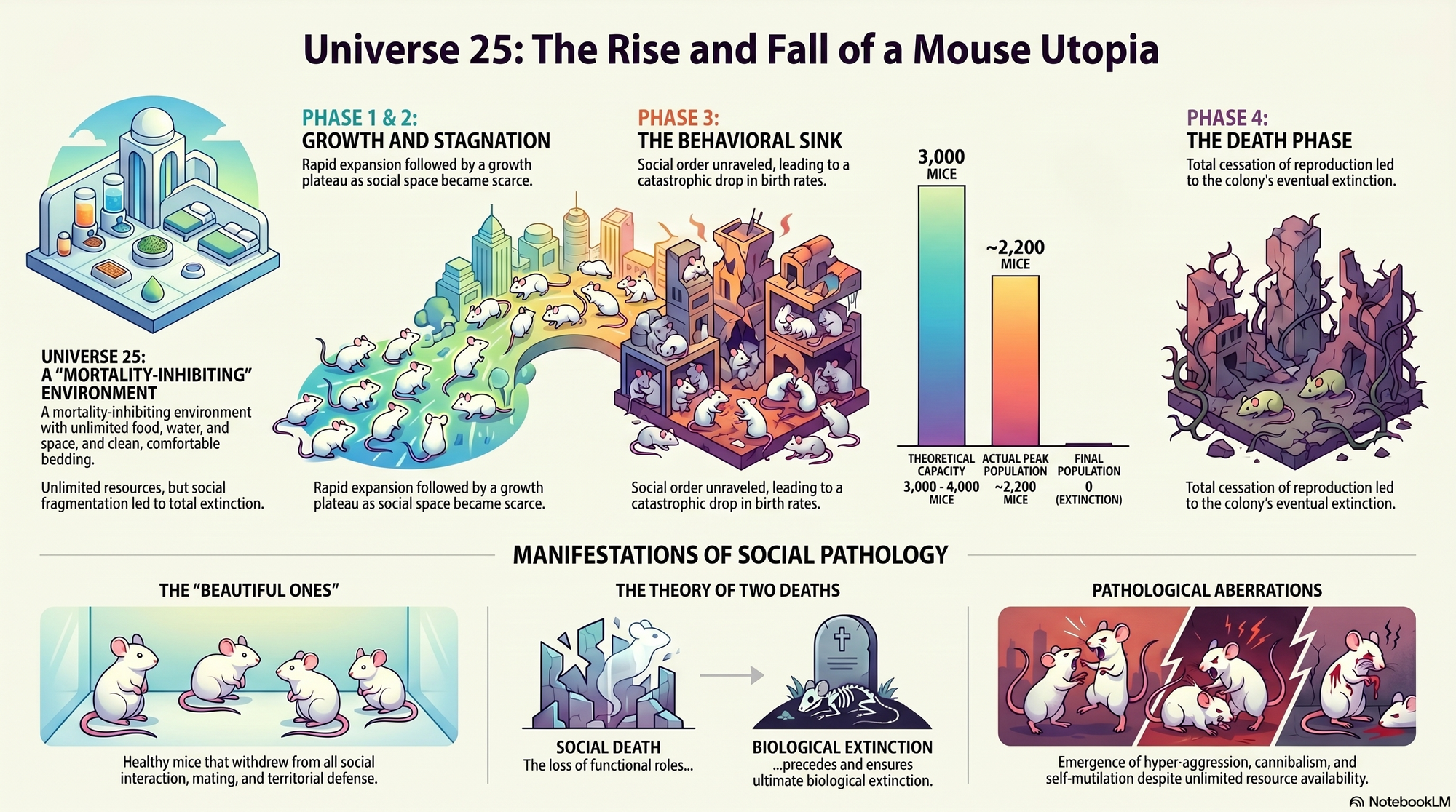 John B. Calhoun’s Universe 25 experiment (conducted in the late 1960s/early 1970s) served as a controlled environment to study the effects of high-density living on rodent populations. The resulting collapse of the colony was interpreted through two primary con...