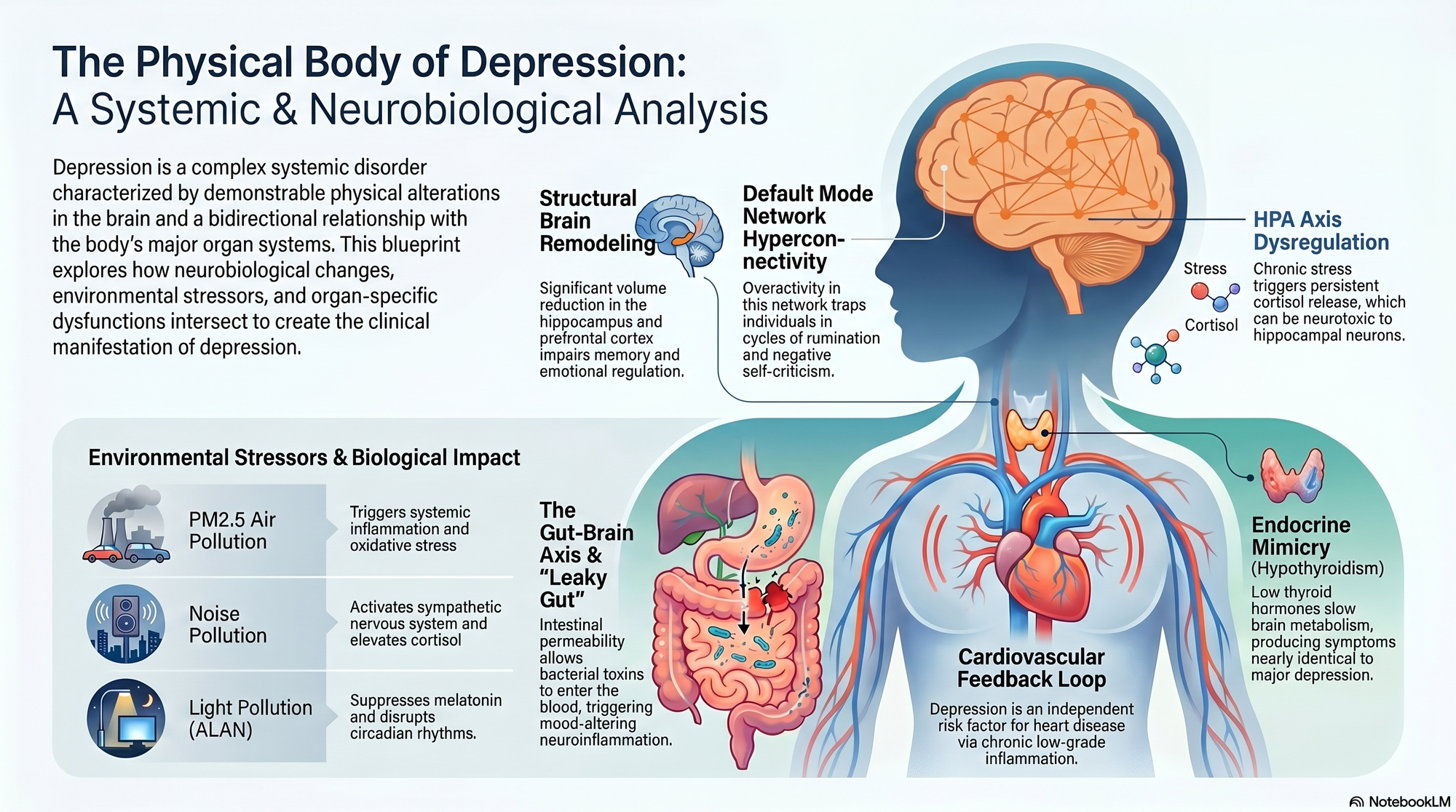 This research comprehensively investigated the multifaceted physical underpinnings of depression, examining its neurobiological correlates, the impact of environmental and nutritional factors, and the intricate relationship with organ system dysfunctions. Our review of neuroimaging and biomarker studies confirms that depression is not solely a psychological construct but is profoundly associated with tangible alterations in brain structure and function, including changes in the hippocampus, amygdala, prefrontal cortex, and anterior cingulate cortex. These neurobiological shifts are intrinsically linked to systemic physiological dysregulation, affecting the cardiovascular, immune, endocrine, and gastrointestinal systems, underscoring a complex, bidirectional interplay. Furthermore, this study synthesized evidence linking environmental stressors such as air and noise pollution, light pollution, lack of green space, and poor housing conditions, alongside nutritional factors like micronutrient deficiencies, inadequate omega-3 intake, high consumption of processed foods, and gut microbiome dysbiosis, to an increased risk and exacerbation of depressive symptoms. The investigation into organ-related etiologies revealed significant associations between thyroid dysfunction, gut-brain axis dysregulation, and cardiovascular health with depression, highlighting that these conditions can both precipitate and be exacerbated by depressive states.