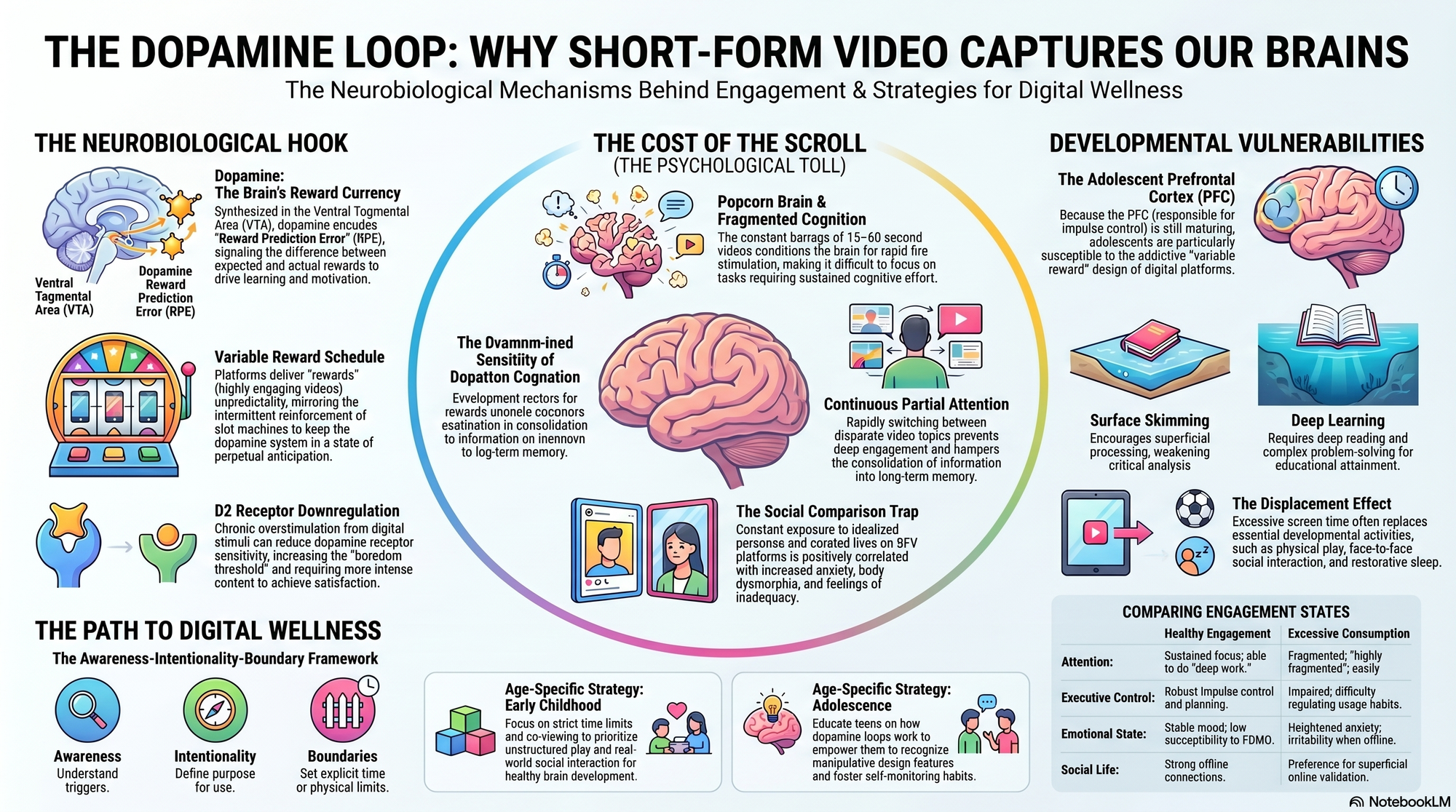 This research has systematically investigated the multifaceted impacts of short-form video (SFV) engagement, drawing upon neurobiological, psychological, and developmental perspectives. Our findings underscore the critical role of dopamine in mediating engagement with SFV content, highlighting how platform design features—such as infinite scroll, algorithmic curation, and variable reward schedules—exploit the brain's reward prediction error mechanisms. This continuous, unpredictable stimulation can foster compulsive behaviors and potentially lead to alterations in reward pathway sensitivity, as detailed in the neurobiological analysis. Psychologically, excessive SFV consumption is linked to a range of adverse effects, including diminished attention spans, increased anxiety, and a potential decline in executive functions due to constant cognitive load and overstimulation. The comparison between high and low engagement patterns reveals observable differences in cognitive control and emotional regulation, suggesting a tangible impact on daily functioning. For the younger generation, the developmental and educational ramifications are particularly significant. While SFV can offer incidental learning opportunities, its rapid pacing and emphasis on immediate gratification pose risks to sustained attention, deep learning, and critical thinking development, potentially displacing more beneficial cognitive activities. The research synthesized these findings to emphasize the imperative for balanced digital engagement strategies, acknowledging that the pervasive nature of these platforms necessitates a proactive approach to mitigate negative consequences and promote well-being across all age groups.
