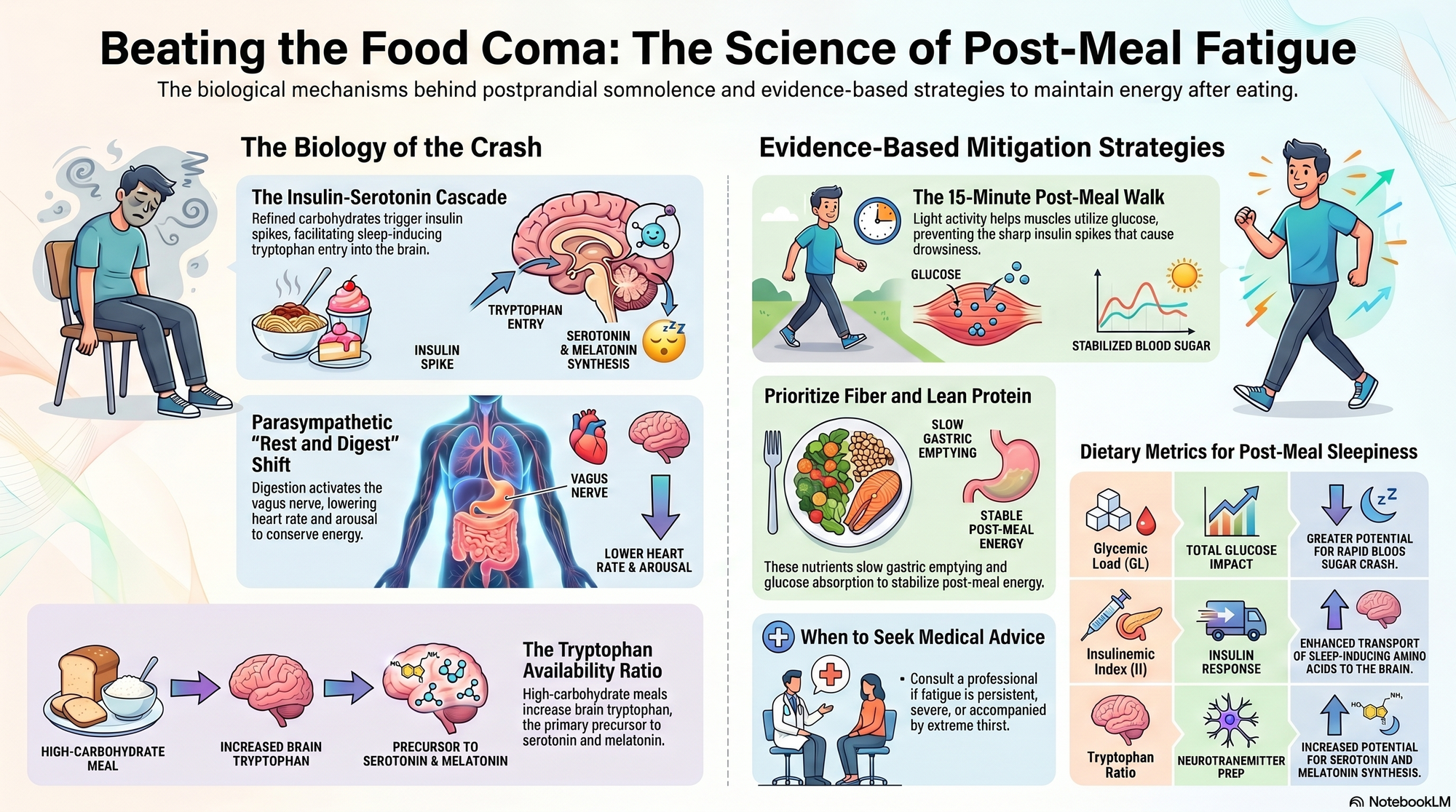 - Summary: Postprandial somnolence, colloquially known as 'food coma,' is a multifaceted physiological phenomenon driven by the integration of macronutrient intake, hormonal fluctuations, and neural signaling. The primary metabolic driver is the postprandial glucose-insulin cascade. High-carbohydrate intake in...